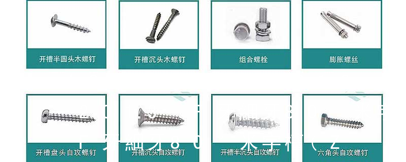 1.機螺釘 2.自攻螺釘 3.鉆尾螺釘 4.墻板釘 5.纖維板釘 6.木螺釘7.六角木螺釘 8.不脫出螺釘 9.組合螺釘 10.微型螺釘 11.家具螺釘 12.電子螺釘頭型:1.六角頭(hexagon head) 2.六角頭法蘭面(hexagon head with flange) 3. (鐵板牙自攻螺絲) B-2: Plastic Tapping Screw. (塑膠用,自攻螺絲) C: Wooden Screw : 木工螺絲 D: Drywall Screw :水泥墻螺絲 E: Self Drilling Screws鉆尾螺絲(不銹鋼鉆尾螺絲,復合材料鉆尾螺絲) F:膨脹螺絲,四片膨脹螺絲又