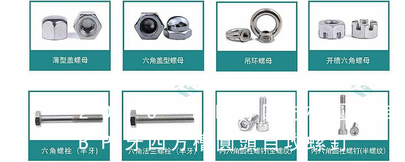 外六角螺栓、內六角螺栓、馬車螺栓、膨脹螺栓、對鎖螺栓、U型螺栓、自攻螺釘、機械螺釘、緊定螺釘、螺柱、牙條、六角螺帽、尼龍螺帽、金屬鎖緊螺帽、四方螺帽、薄螺帽、蓋型螺帽、蝶型螺帽、法蘭面螺帽、鉚螺帽、圓螺帽、吊環 6. 木螺釘:也是與機器螺釘相似,但螺桿上的螺紋為專用的木螺釘用羅紋,可以直接旋入木質構件(或零件)中,用于把一個帶通孔的金屬(或非金屬)零件與一個木質構件緊固連接在一起。這種連接也是屬于可以拆卸連接。7. 墊圈